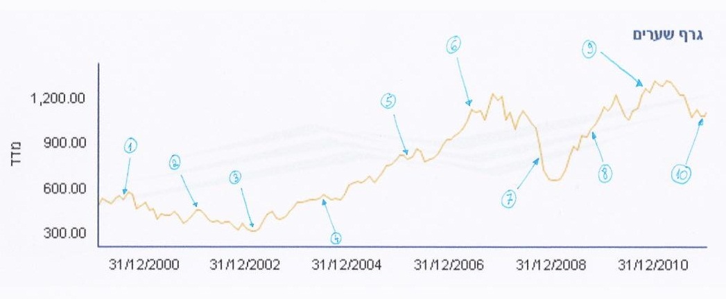בכל מקרה, למרות שלמדתי המון על שוק המניות לא "הצלחתי" יותר מדי. אפשר לראות לפי הגרף שבו מצוינות 10 נקודות ההחלטה שלי על גרף מדד ת"א 25 משנת 2000 ועד היום שאם אני רוצה להרוויח משהו אני חייב לאמץ קוף.