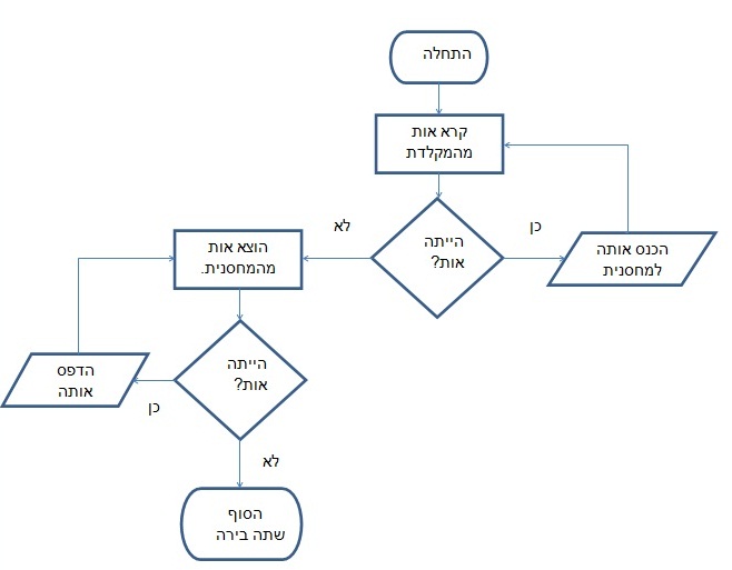 אלגוריתמים נכתבים כסדרה של צעדים עם התניות ואם ניקח את הבעיה של הפיכת המשפט שפתרנו בעזרת מחסנית זה יראה בתרשים כך: