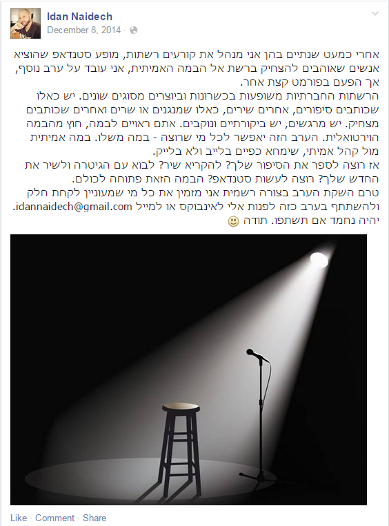 שנים שאני מפנטז לעלות על במה במועדון סטנד-אפ. האמת שזה לא מסובך. לכל מועדון סטנד-אפ יש פעם בשבוע ערב "במה פתוחה" שבה אנשים יכולים לעלות על הבמה ולנסות. אבל תמיד מצאתי תירוצים: אני צריך עוד זמן כדי לשפר את הקטע שלי, זה בתל-אביב ואין שם חניה או עכשיו חורף ואנשים פחות צוחקים. אבל הפעם שקראתי על הערב שעידן מארגן, ערב שיקבל את השם "תעשה לי לייב", החלטתי שזהו, הגיע הזמן.