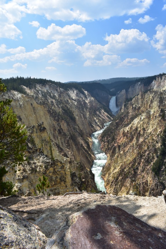 בפארק יש גם גרנד קניון, אמנם קטן אבל יפה ומיוחד. התכנון שלנו היה ללכת לאורך ה South Rim Trail שמתחיל בגשר שעובר מעל נהר הילוסטון אך לדאבוננו כשהגענו גילינו שהשביל סגור עקב עבודות שיפוץ (מומלץ תמיד לקרוא על מצב השבילים באתר הרשמי של הפארק). המשכנו במכונית לאורך South Rim Dr כדי להגיע ל Artist Point ואז נתקענו בפקק (השעה הייתה 13:00 – שעת השיא). לבסוף מצאנו חניה והלכנו לנקודת התצפית על הקניון שנוצר די מהר (במושגים גיאולוגים) עקב האבן המיוחדת שיש באיזור ושטף המים שפרץ אחרי שהקרחונים ששלטו באיזור נשברו. את האינפורמציה הזאת קיבלנו מהרצאה של רינג'רית נחמדה. בנקודה זאת החלטנו ללכת במסלול הליכה בדרגת קושי בינונית לאורך המצוק עד לנקודת תצפית בשם Point Sublime (אורך כולל הלוך וחזור – 5 ק"מ. אפשר גם לחתוך באמצע לכיוון אגם קטן).