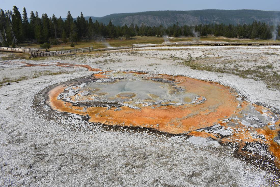 כשגמרנו את המסלול, נסענו מערבה לכיוון היציאה המערבית של הפארק ועצרנו ב Norris Geyser Basin – איזור נוסף של פעילות גיאוטרמית. יש במקום שני מסלולים ואנחנו בחרנו הפעם בקצר. בכל האיזורים הגיאוטרמית נבנו שבילי עץ שעוברים קרוב מאד לכל התופעות הגיאוטרמיות כמו בריכות צבעוניות (עקב האורגניזמים שחיים שם) וגייזרים שמתפרצים.